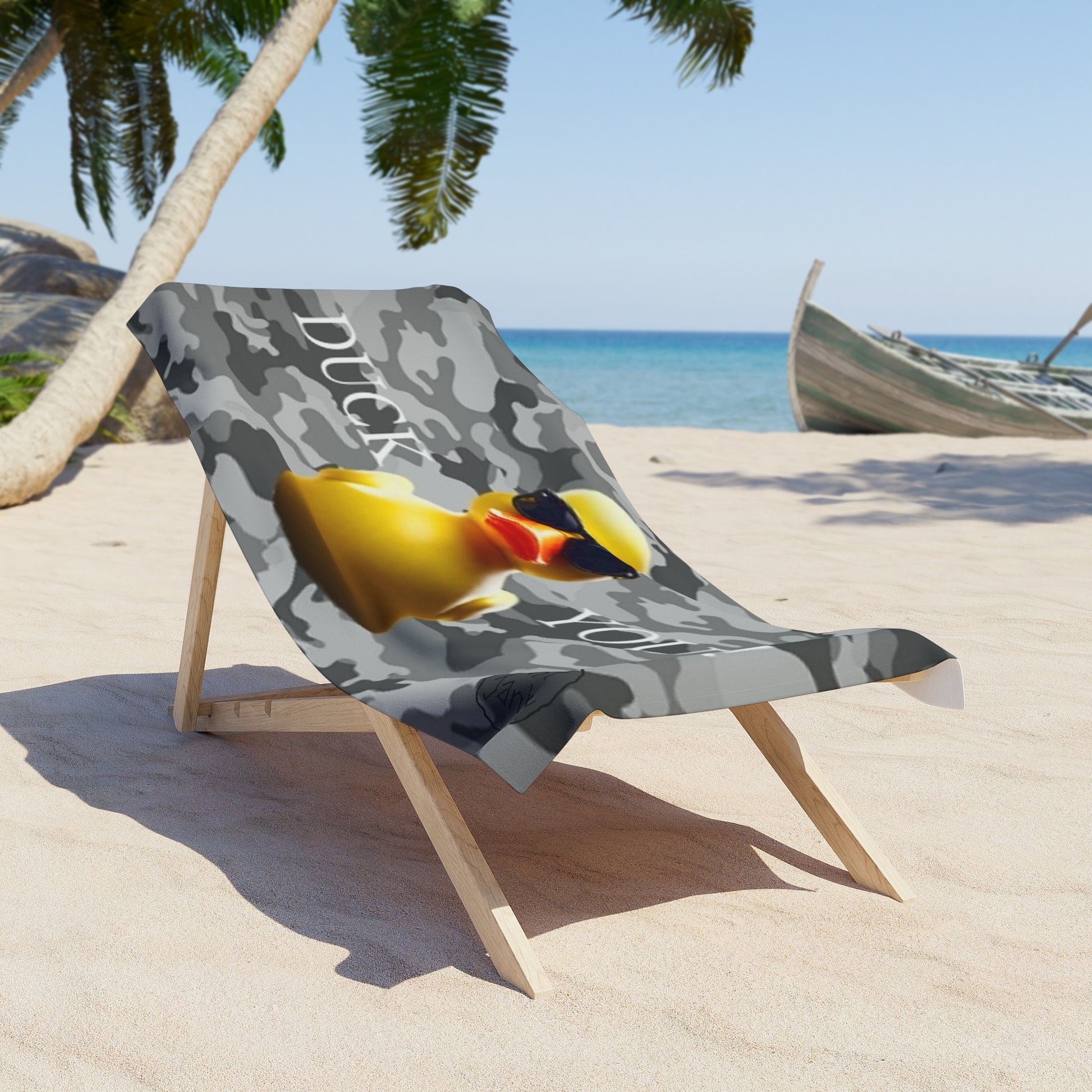 Our DUCK YOU Beach Towel is sure to turn heads. Soft, quick-drying and available in 2 sizes. Camo background, duck in sunglasses and a not-so-subtle "DUCK YOU" featured on one side.